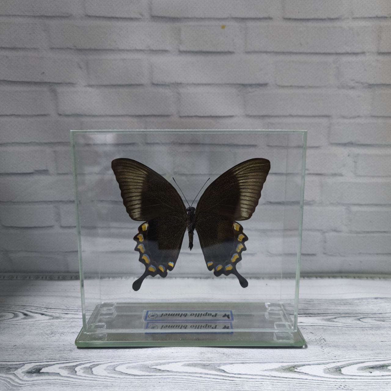Справжній метелик закріплений в скляному кубі, що дає можливість розглянути всі тонкощі візерунків і відтінків метелика з будь-якого боку.