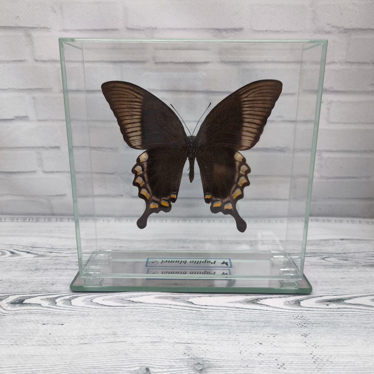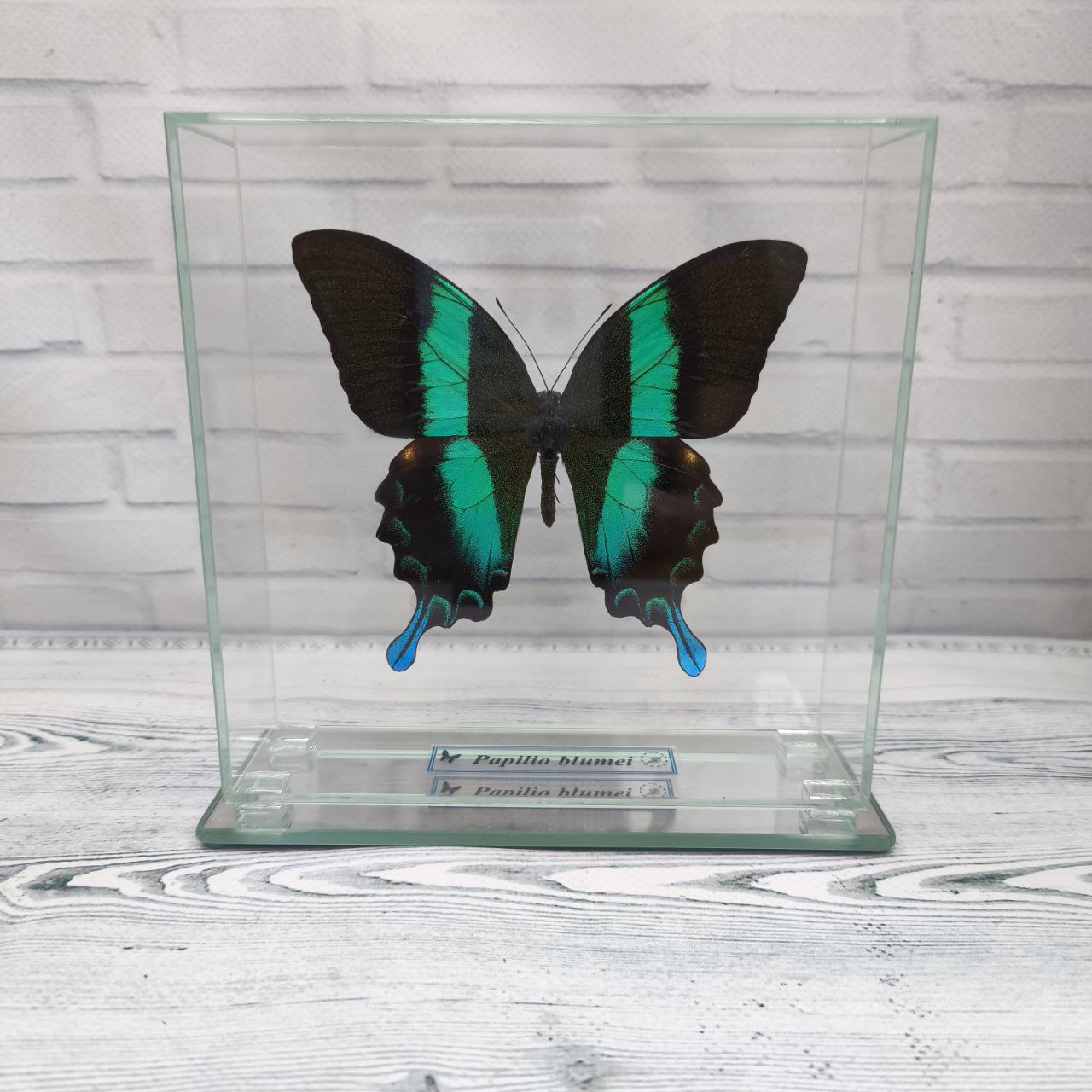 Справжній метелик закріплений в скляному кубі, що дає можливість розглянути всі тонкощі візерунків і відтінків метелика з будь-якого боку.