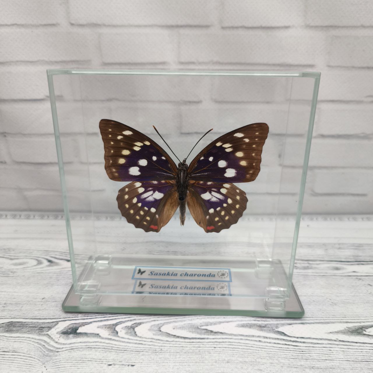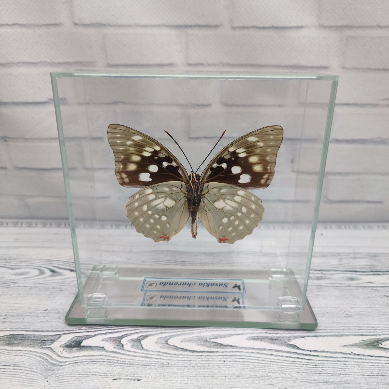 Справжній метелик закріплений в скляному кубі, що дає можливість розглянути всі тонкощі візерунків і відтінків метелика з будь-якого боку.