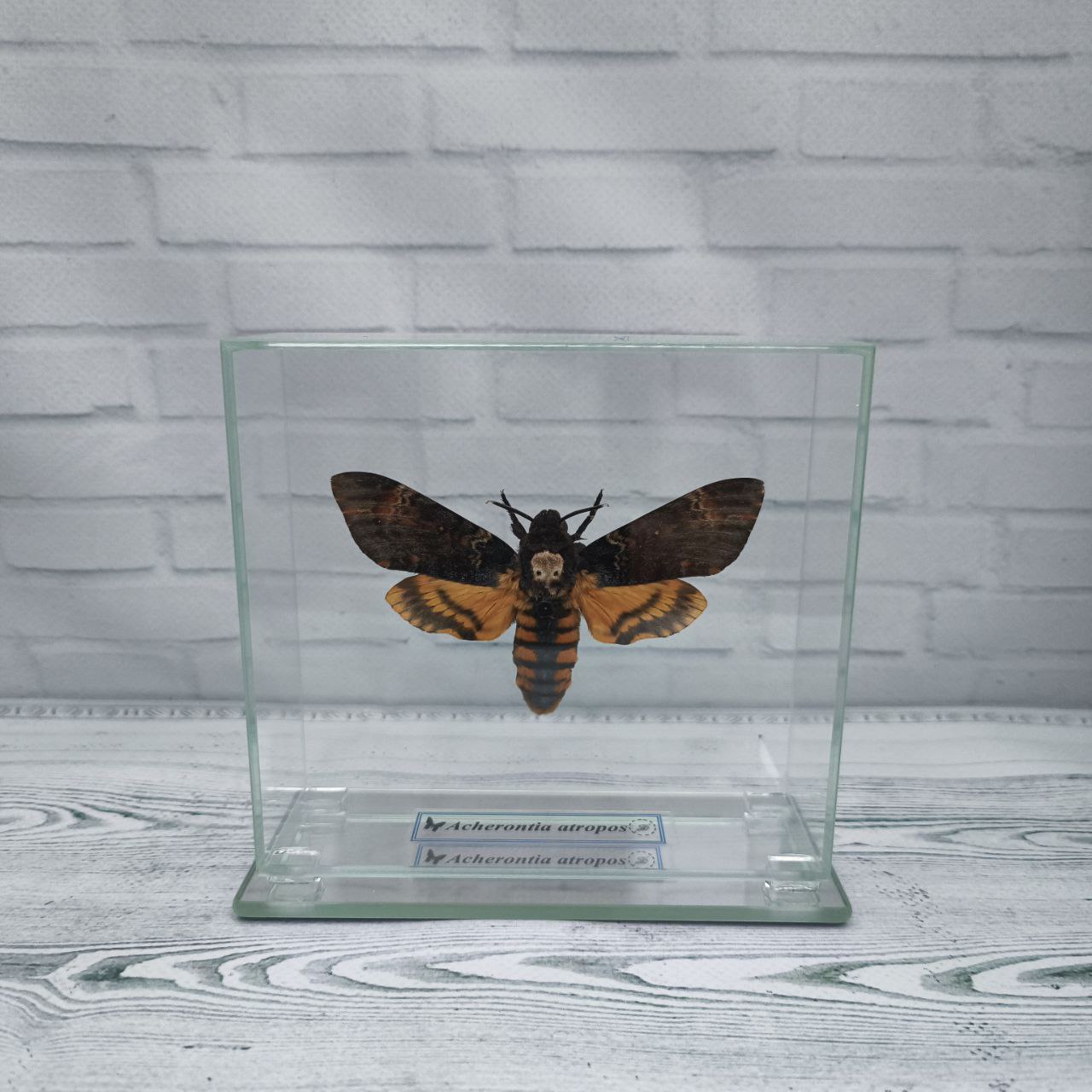 Справжній метелик закріплений в скляному кубі, що дає можливість розглянути всі тонкощі візерунків і відтінків метелика з будь-якого боку.