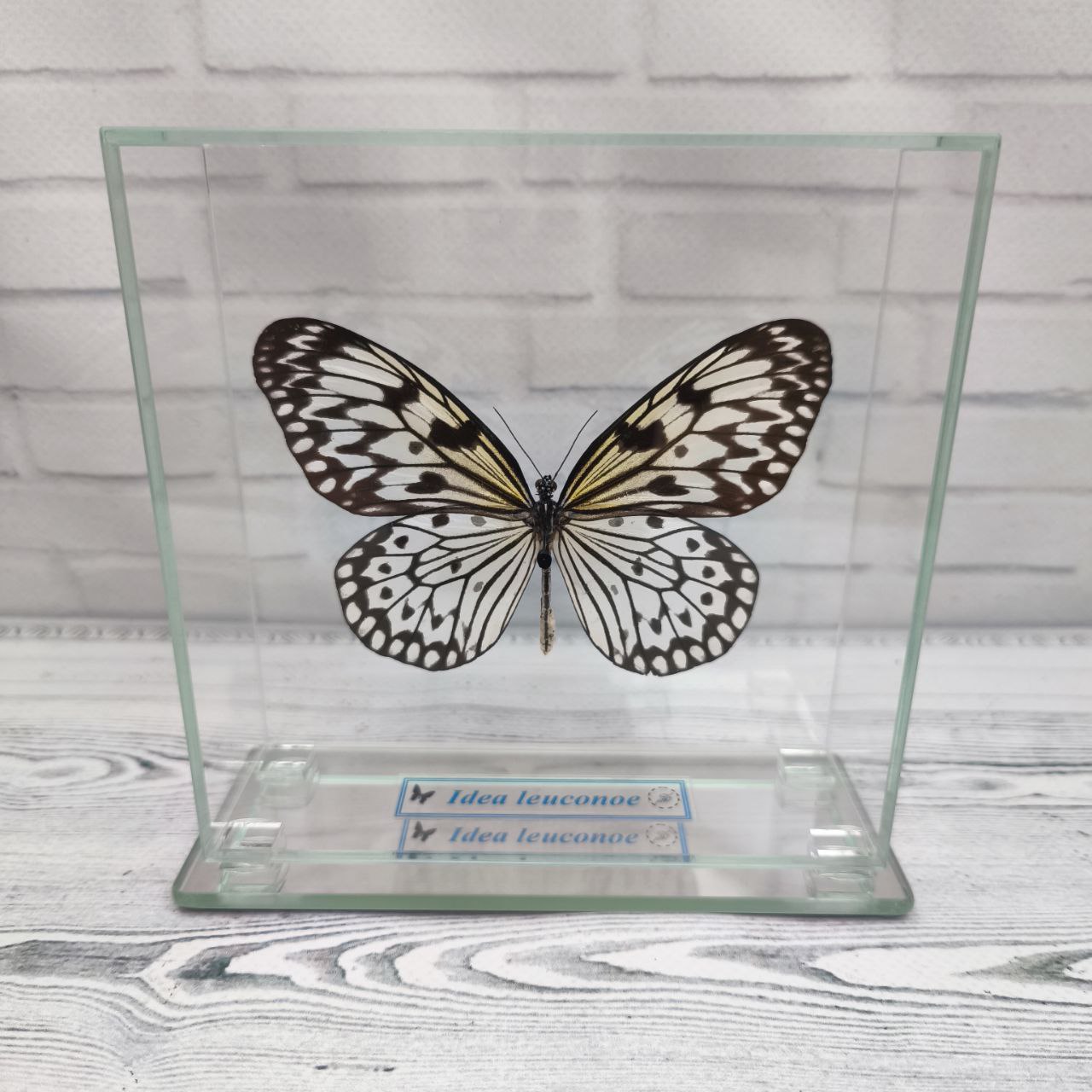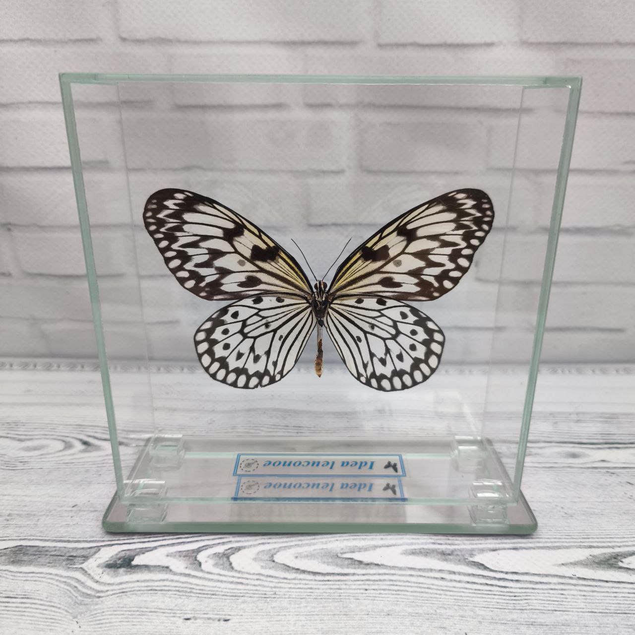 Справжній метелик закріплений в скляному кубі, що дає можливість розглянути всі тонкощі візерунків і відтінків метелика з будь-якого боку.