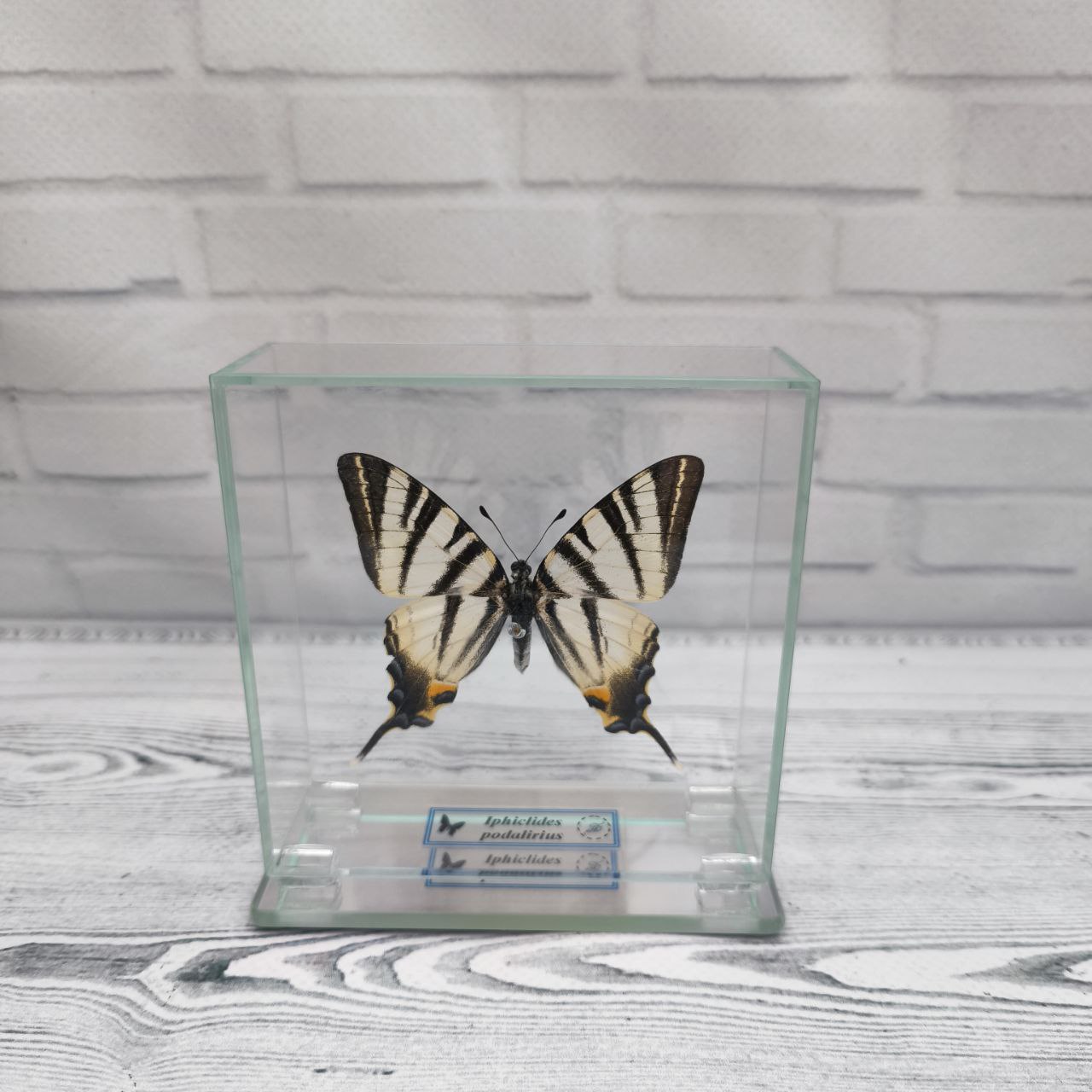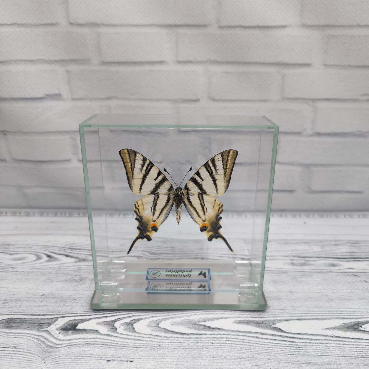 Справжній метелик закріплений в скляному кубі, що дає можливість розглянути всі тонкощі візерунків і відтінків метелика з будь-якого боку.