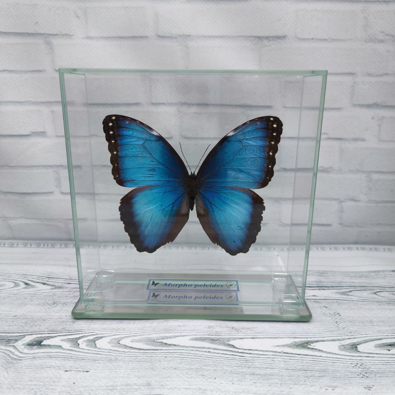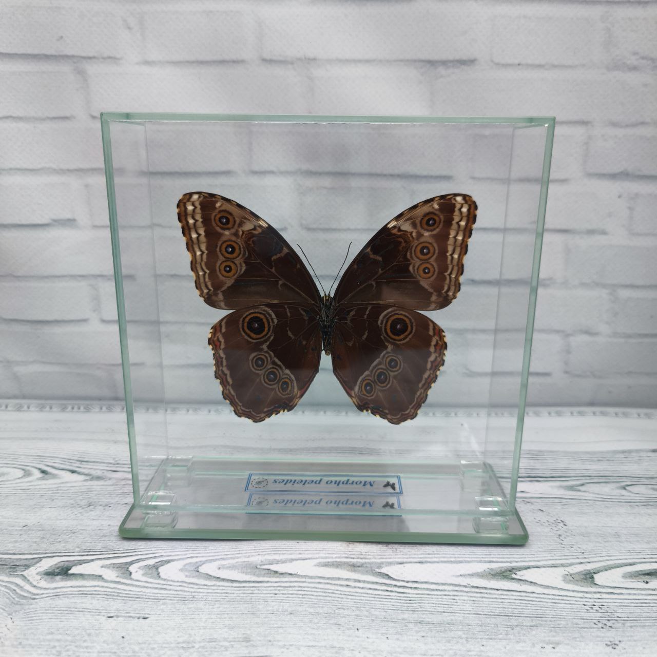 Справжній метелик закріплений в скляному кубі, що дає можливість розглянути всі тонкощі візерунків і відтінків метелика з будь-якого боку.