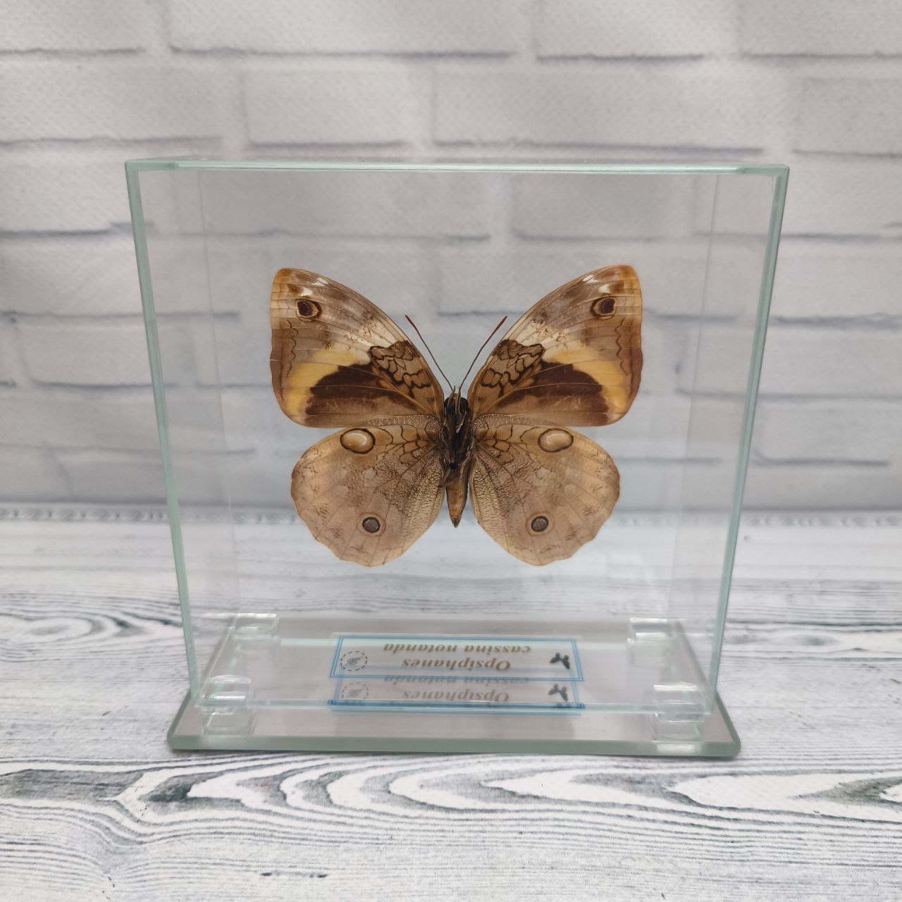 Справжній метелик закріплений в скляному кубі, що дає можливість розглянути всі тонкощі візерунків і відтінків метелика з будь-якого боку.