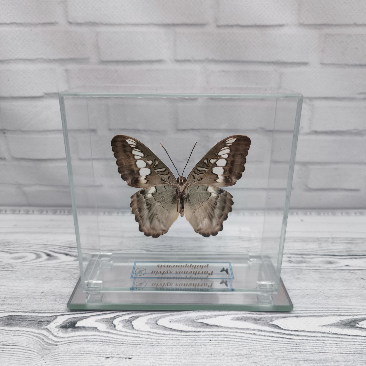 Справжній метелик закріплений в скляному кубі, що дає можливість розглянути всі тонкощі візерунків і відтінків метелика з будь-якого боку.