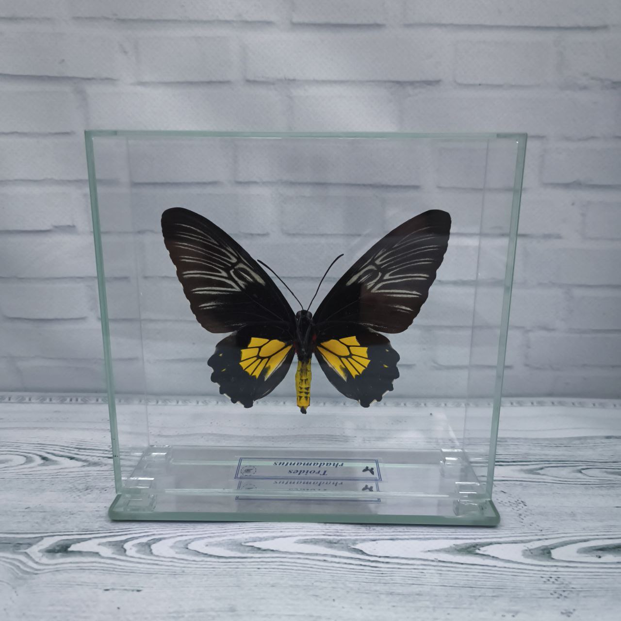 Справжній метелик закріплений в скляному кубі, що дає можливість розглянути всі тонкощі візерунків і відтінків метелика з будь-якого боку.