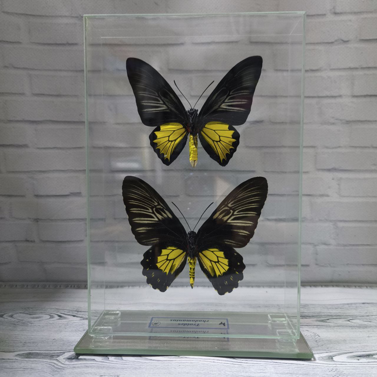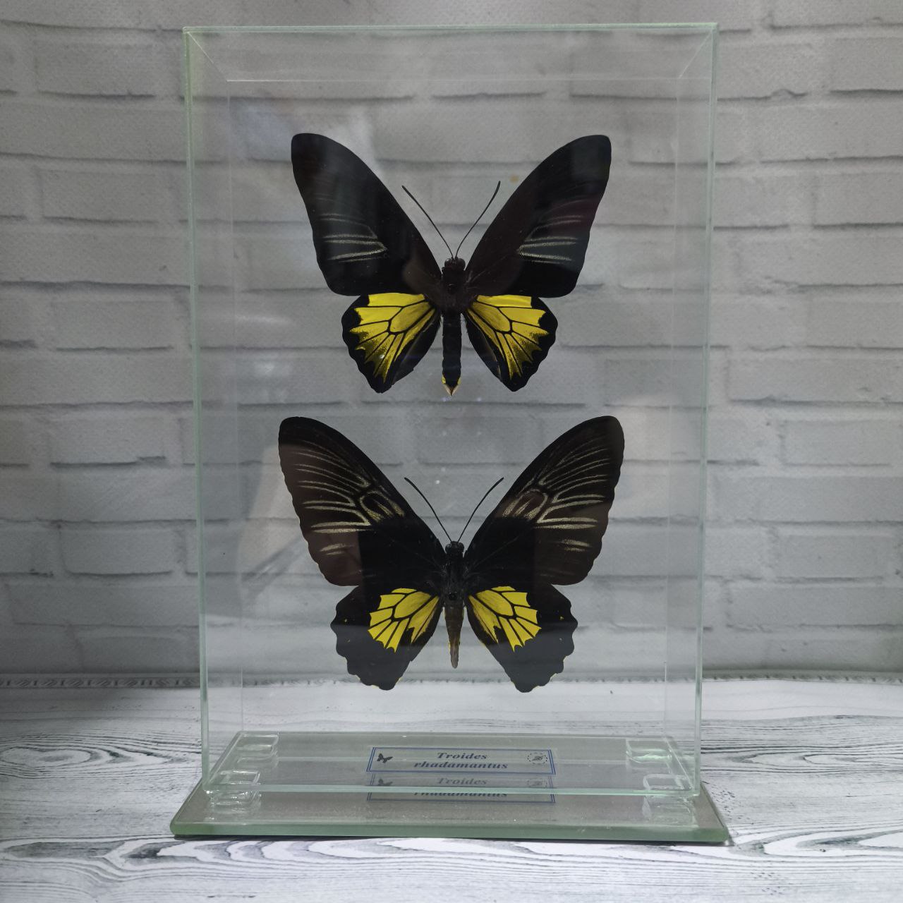 Справжній метелик закріплений в скляному кубі, що дає можливість розглянути всі тонкощі візерунків і відтінків метелика з будь-якого боку.