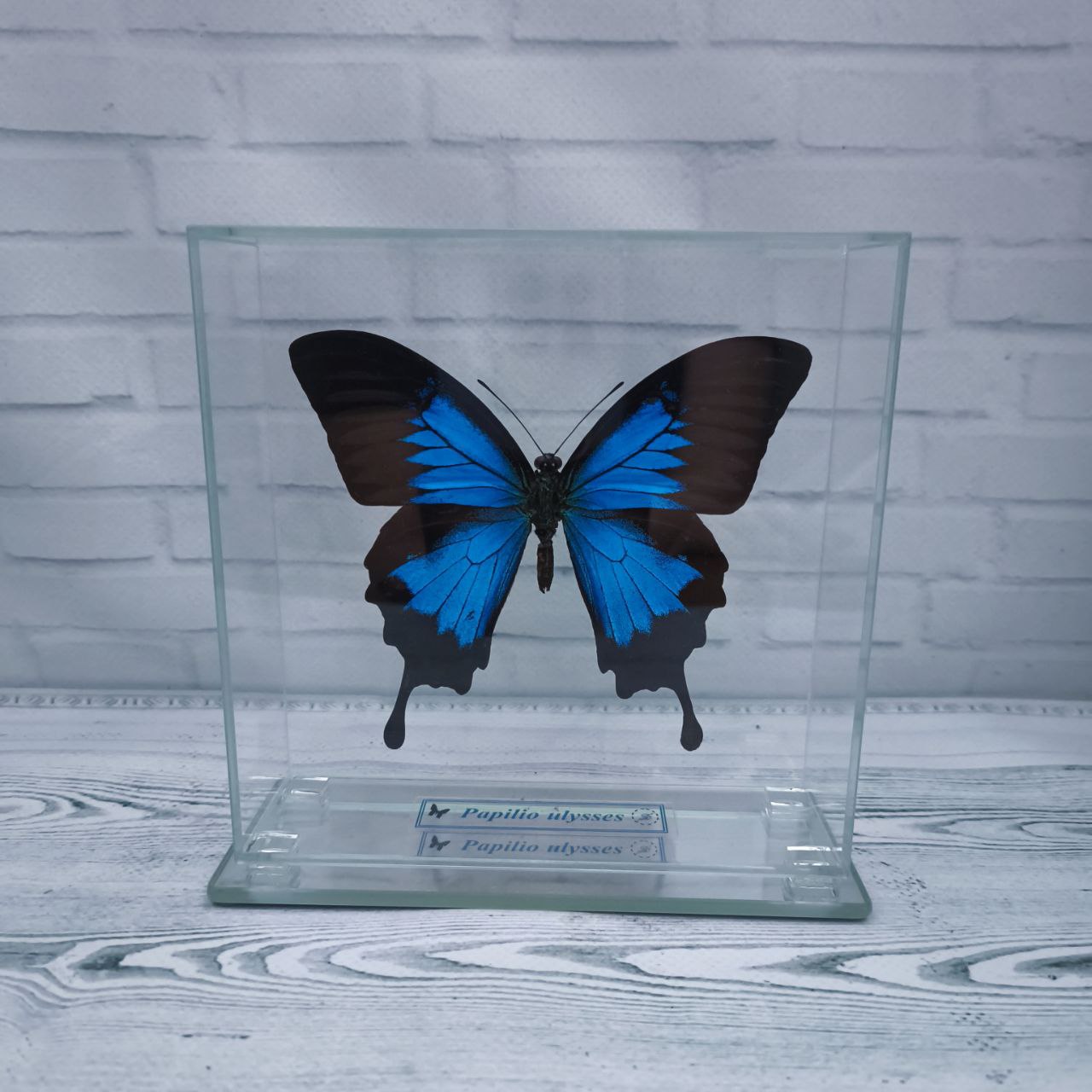 Справжній метелик закріплений в скляному кубі, що дає можливість розглянути всі тонкощі візерунків і відтінків метелика з будь-якого боку.